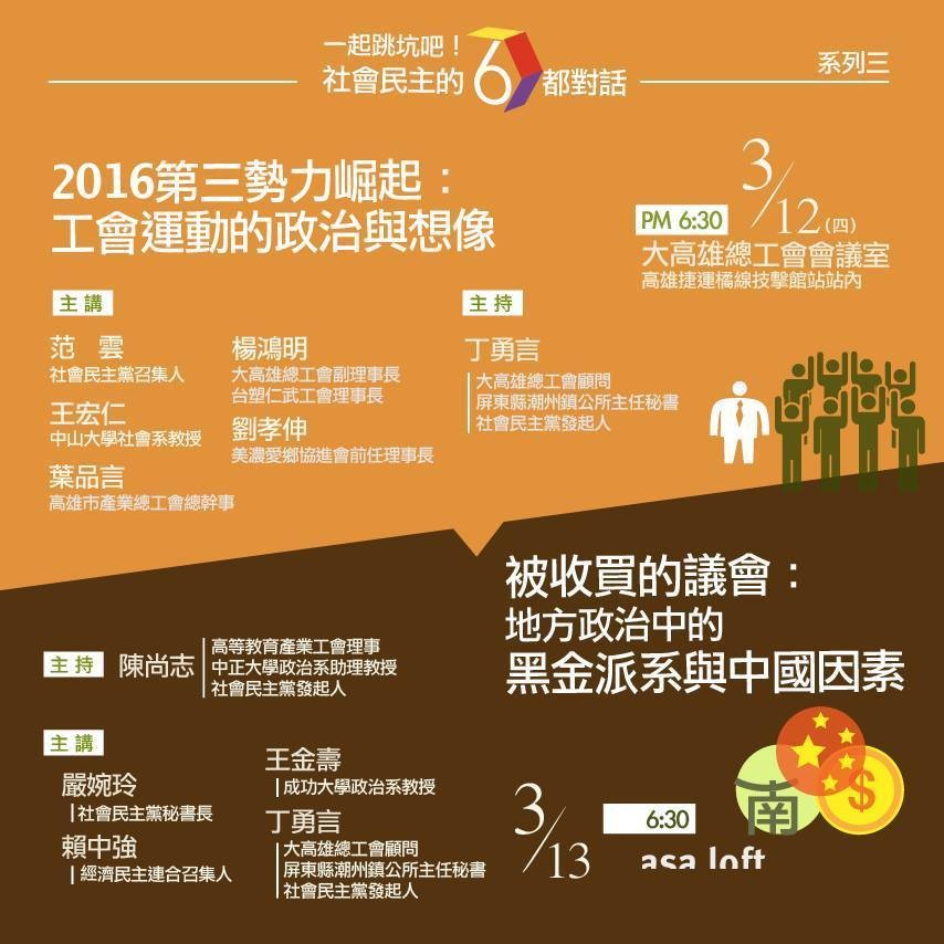 「社會民主黨」在世界上許多國家,大多和工會運動有著相當大的關連,在台灣,我們的成立是否和工會運動的政治想像有連結?我們將透過與高雄在地工會幹部們的對話,梳理整個脈絡。
